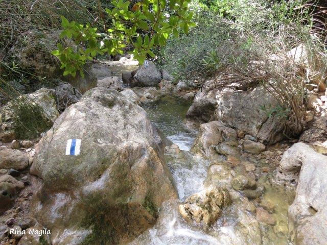 After visiting the tomb and the memorial, return to the parking lot and descend on the blue trail to the Hazuri Stream. Walk carefully between the large boulders, shaded by the Mediterranean trees growing along the stream. After about one-and-a-half kilometers, you will reach a signpost at the intersection of two trails: