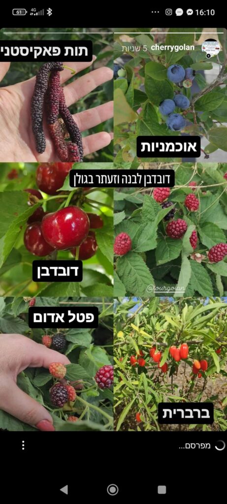 קטיף עצמי דובדבן, פירות יער, שזיף ירוק, שזיף אדום, פטל, אוכמניות, אוסנת, חזרזר, דומדומנית, ברבריס, תות פאקיסטני, תות שאמי, תות שחור, תאינים, סאברס, מישמש, חפושים, ענבים, וישנייה, אפרסימון, אגוזים, רימונים, נקטרינה, ועוד. אבל שימו לב כל פרי והעונה שלו, לא מוצאים הכל בשל יחד.