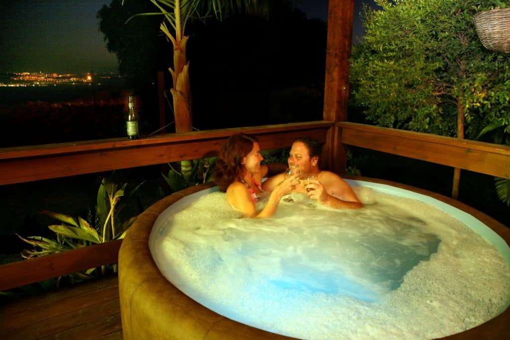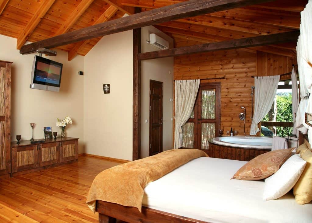 אין צורך לצאת החוצה בפנים פינוקים רבים: בקבוק יין מיקבי רמת הגולן להתענג עליו בג’קוזי, וארוחת הבוקר הכפרית מגיעה עד המיטה.