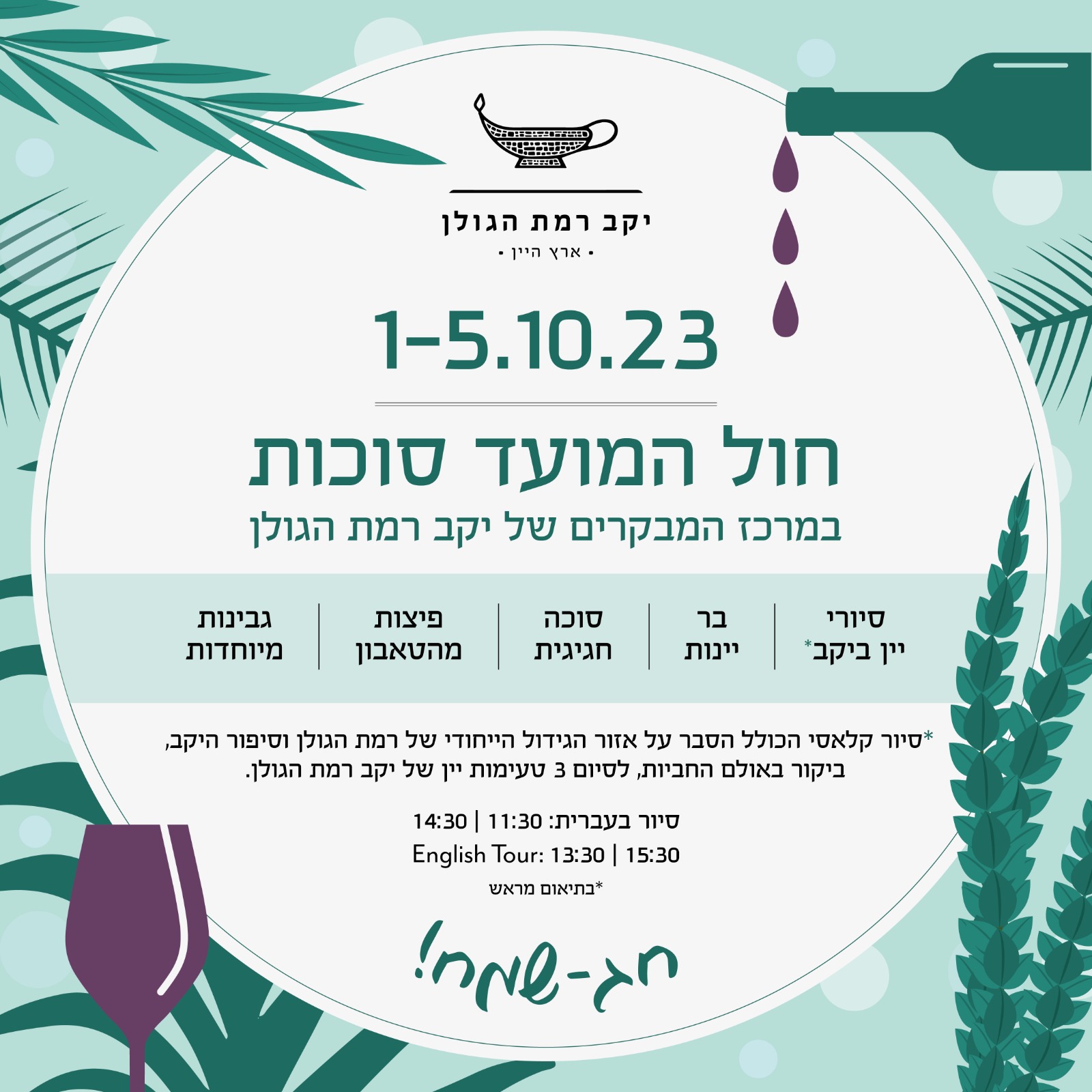 מתי? חוה”מ סוכות 01-05.10 משעה 13:00 עד הערב.